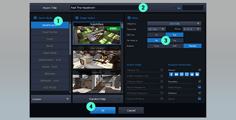 ที่นี่คุณสามารถทำการตั้งค่าของคุณเองสำหรับห้องของคุณเช่นโหมดอาวุธ, ชนะ / ฆ่าและการตั้งค่าอื่น ๆ