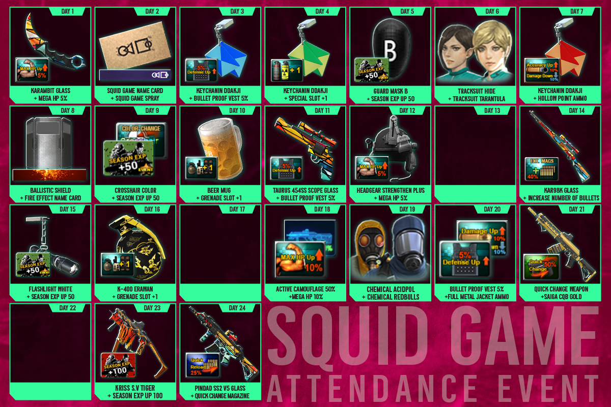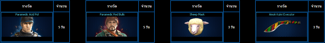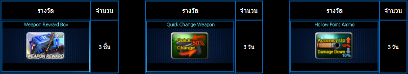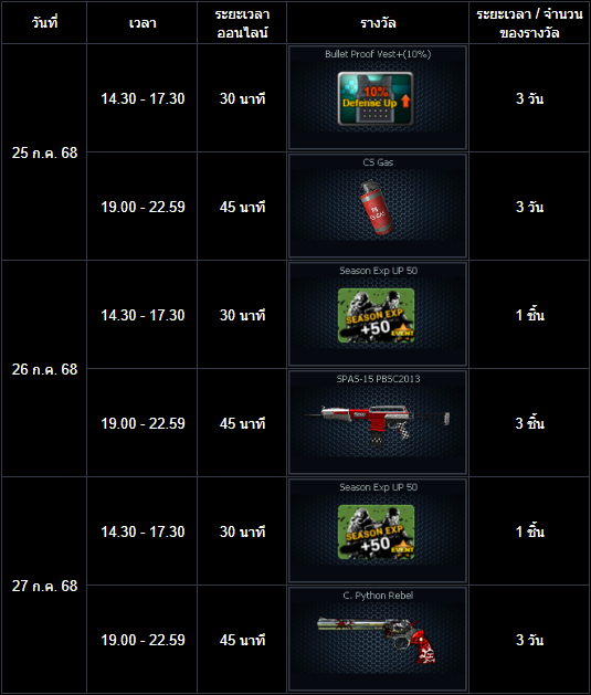 ![]() รูปไอเทม "Alphabet T" หมายเหตุ *ชิ้นส่วนสามารถหาได้จากกล่อง "T77 Hilal Dura Box" (อัตราส่วนการได้รับ = 1กล่อง ต่อ 1ชิ้น)* **หากหมดช่วงระยะเวลากิจกรรม ไอเทม "Alphabet T" ที่ไม่เข้าเงื่อนไขการแลกเปลี่ยนจะถูกดำเนินการแบ่งได้เป็น 2 กรณีหลักๆ ดังนี้ 1.มีไอเทม Alphabet T น้อยกว่า 400 ชิ้น จะถูกเปลี่ยนเป็นไอเทม "Gold Ticket" ในอัตราส่วน 1 Alphabet ต่อ 2 Gold Ticket ** หรือ 2. มีไอเทม Alphabet T มากกว่า 400 ชิ้นขึ้นไป ผู้เล่นจะได้รับอาวุธถาวรในซีรีส์นั้นๆ โดยการหักตามจำนวนการการันตี ในที่นี้คือ 400 ชิ้น ในส่วนที่เกินมานั้นจะถูกเปลี่ยนเป็นไอเทม "Gold Ticket" ในอัตราส่วน 1 Alphabet ต่อ 2 Gold Ticket) ![]() เซ็ต Pindad SS2 Element of Nature 7 วัน ระยะเวลาเปิดจำหน่ายตั้งแต่วันที่ : 23 กรกฎาคม - 5 สิงหาคม 2568 (ไอเทมจะทำการเปิดจำหน่ายจนถึงระยะเวลาก่อนปิดปรับปรุงเซิร์ฟเวอร์) ![]() การ์ดภารกิจ : แผนที่วิลล่า! ระยะเวลากิจกรรม: 23 กรกฎาคม - 4 สิงหาคม 2568 พบกับ การ์ด : วิลล่า ภารกิจในแผนที่ใหม่ สำเร็จภารกิจให้ครบเพื่อรับรางวัลมากมาย ดังนี้ รางวัลต่างๆที่สามารถรับได้จากบัตรภารกิจ การ์ดภารกิจ : ไฮดร้า พาร์ท 3 กิจกรรม แจกของรางวัลต้อนรับผู้เล่นใหม่! ระยะเวลากิจกรรม : 23 กรกฎาคม - 4 สิงหาคม 2568 เพียงสมัครและเข้าเกมในช่วงระยะเวลากิจกรรม เพื่อรับของรางวัลตามรายการดังนี้ ![]() กิจกรรม ล็อกอินรับไอเทมประจำวัน! ระยะเวลากิจกรรม : 23 กรกฎาคม - 4 สิงหาคม 2568 เพียงเข้าเกมในช่วง "ระยะเวลากิจกรรม" เพื่อรับของรางวัลตามรายการ ดังนี้ * ไอเทมทุกชิ้นจากกิจกรรมจะมีอายุการใช้งาน 1 วัน* **ไอเทมจะถูกเปิดใช้งานทันทีเมื่อเข้าตัวหรืออยู่ในคลังอาวุธของผู้เล่น** กิจกรรม สะสมเวลาล็อกอินสุดสัปดาห์ประจำเดือนกรกฎาคม2568 ระยะเวลากิจกรรม : 25 - 27 กรกฎาคม 2568 เพียงเข้าเกมและสะสมเวลาออนไลน์ให้ครบตามที่กำหนดเวลาในช่วง "ระยะเวลากิจกรรม" เพื่อรับรางวัลดังต่อไปนี้ ตาราง ล็อกอินต่อเนื่อง Squid Game อีเว้นท์ ประจำเดือนกรกฎาคม2568 ระยะเวลากิจกรรม : 2 - 29 กรกฎาคม 2568 เพียงล็อกอินเข้าเกมในช่วงระยะเวลากิจกรรมเพื่อรับไอเทมดังต่อไปนี้ ตารางโบนัส EXP & Point ประจำเดือนกรกฎาคม 2568 |