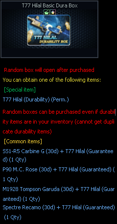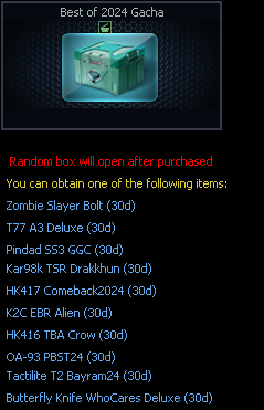 และในช่วงเวลาเดียวกันยังมี กล่องสุ่ม Barrett M82A1 Hilal ถาวร ให้สำหรับผู้เล่นที่ต้องการเสี่ยงโชคอีกด้วย(23 กรกฎาคม - 5 สิงหาคม 2568)