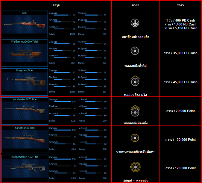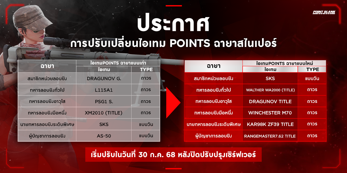 ปลดล็อคอาวุธฉายาพลลอบยิงใหม่ วันที่อัปเดต: วันที่ 30 กรกฎาคม 2568 เป็นต้นไป ทางเกมจะทำการปรับเปลี่ยน อาวุธประจำฉายาพลลอบยิงใหม่ทั้งสาย เหตุอันเนื่องมาจากการปรับสมดุลอาวุธหลายครั้งที่ผ่านมา นี่ถือเป็นโอกาสที่ดี ที่ผู้เล่นจะได้เข้าสัมผัสประสบการณ์และอาวุธฉายาพลลอบยิงใหม่ ไรเฟิลซุ่มยิงประจำฉายาก่อนหน้านี้ จะถูกแทนที่ด้วยปืนประจำฉายาใหม่ในวันที่ 30 กรกฎาคม (หลังการปิดปรับปรุงเซิร์ฟเวอร์) ผู้เล่นสามารถตรวจสอบการปรับเปลี่ยนอาวุธประจำฉายาได้ ดังนี้ ** หมายเหตุ: หากผู้เล่นได้รับฉายาแล้ว สามารถซื้อปืนไรเฟิลซุ่มยิงประจำฉายาก่อนหน้านี้ได้ ก่อนปิดปรับปรุงเซิร์ฟเวอร์วันที่ 30 กรกฎาคม 2568 นี้เท่านั้น =====================