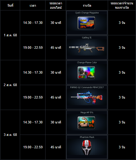 อัปเดต ตารางล็อกอินต่อเนื่องประจำเดือนสิงหาคม2568 (2 - 29 กรกฎาคม 2568) ![]() Turkey ซีรีส์ ระยะเวลาเปิดจำหน่ายตั้งแต่วันที่ : 30 กรกฎาคม - 12 สิงหาคม 2568 (ไอเทมจะทำการเปิดจำหน่ายจนถึงระยะเวลาก่อนปิดปรับปรุงเซิร์ฟเวอร์) "พิเศษโบนัส 150% EXP & Point เมื่อใช้อาวุธหลักของซีรีส์" ![]() ![]() ![]() ![]() กล่องสุ่ม Mercury Saber V2 ระยะเวลาเปิดจำหน่ายตั้งแต่วันที่ : 30 กรกฎาคม - 6 สิงหาคม 2568 (ไอเทมจะทำการเปิดจำหน่ายจนถึงระยะเวลาก่อนปิดปรับปรุงเซิร์ฟเวอร์) *ภาพแสดงไอเทมเพียงบางส่วนผู้เล่นสามารถตรวจสอบของราววัลทั้งหมดได้จากร้านค้าภายในเกม เซ็ต Semi Package 1 วัน ระยะเวลาเปิดจำหน่ายตั้งแต่วันที่ : 23 กรกฎาคม - 5 สิงหาคม 2568 (ไอเทมจะทำการเปิดจำหน่ายจนถึงระยะเวลาก่อนปิดปรับปรุงเซิร์ฟเวอร์) ![]() กิจกรรม แจกของรางวัลต้อนรับผู้เล่นใหม่! ระยะเวลากิจกรรม : 23 กรกฎาคม - 4 สิงหาคม 2568 เพียงสมัครและเข้าเกมในช่วงระยะเวลากิจกรรม เพื่อรับของรางวัลตามรายการดังนี้ ![]() กิจกรรม ล็อกอินรับไอเทมประจำวัน! ระยะเวลากิจกรรม : 23 กรกฎาคม - 4 สิงหาคม 2568 เพียงเข้าเกมในช่วง "ระยะเวลากิจกรรม" เพื่อรับของรางวัลตามรายการ ดังนี้ * ไอเทมทุกชิ้นจากกิจกรรมจะมีอายุการใช้งาน 1 วัน* **ไอเทมจะถูกเปิดใช้งานทันทีเมื่อเข้าตัวหรืออยู่ในคลังอาวุธของผู้เล่น** กิจกรรม สะสมเวลาล็อกอินสุดสัปดาห์ประจำเดือนกรกฎาคม2568 ระยะเวลากิจกรรม : 1 - 3 สิงหาคม 2568 เพียงเข้าเกมและสะสมเวลาออนไลน์ให้ครบตามที่กำหนดเวลาในช่วง "ระยะเวลากิจกรรม" เพื่อรับรางวัลดังต่อไปนี้ ตาราง ล็อกอินต่อเนื่อง ประจำเดือนสิงหาคม2568 ระยะเวลากิจกรรม : 30 กรกฎาคม - 26 สิงหาคม 2568 เพียงล็อกอินเข้าเกมในช่วงระยะเวลากิจกรรมเพื่อรับไอเทมดังต่อไปนี้ ตารางโบนัส EXP & Point ประจำเดือนสิงหาคม 2568 |
