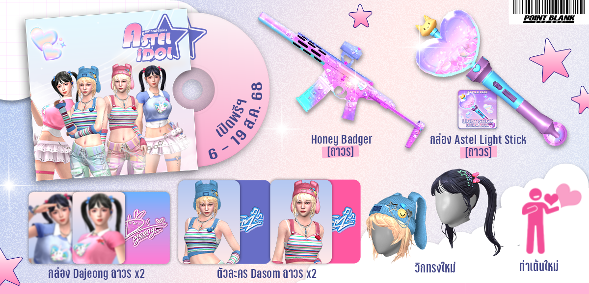 Season Exp UP 1,000 (ขึ้นเลเวล Battle Pass ไปเลเวล 17 ทันที) ขั้นตอนการ Pre-order 1. ทำการซื้อ "ตั๋วจอง Battle Pass ล่วงหน้า" ซึ่งเปิดจำหน่ายที่ IN-GAME SHOP ผู้เล่นสามารถตรวจสอบได้ที่หมวดหมู่ไอเท็ม (ITEM) เพื่อทำการซื้อ "ตั๋วจอง Battle Pass ล่วงหน้า" (ภาพตัวอย่าง "ตั๋วจอง Battle Pass ล่วงหน้า") 2. หลังจากซื้อและครอบครองไอเท็ม "ตั๋วจอง Battle Pass ล่วงหน้า" เรียบร้อยแล้ว ระบบจะทำการเปลี่ยนไอเท็มดังกล่าวเป็น Premium Battle Pass เมื่อ Battle Pass ใหม่ถูกอัปเดตเข้าเซิฟเวอร์ 3. เมื่อได้รับ Premium Battle Pass เรียบร้อย "ตั๋วจอง Battle Pass ล่วงหน้า" จะทำการลบออกจากกระเป๋าสัมภาระผู้เล่นทันที ระยะเวลาการเปิด Pre-Order: 6 - 19 สิงหาคม 2568 และ วันที่ได้รับ Premium Battle Pass : 20 สิงหาคม 2568 ไฮไลต์ของรางวัล Battle Pass : Astel Idol อาวุธหลัก : Honey Badger Astel (ถาวร) [Honey Badger Astel (ถาวร) จะได้รับจาก Battle Pass Premium Level 45] อาวุธประชิด : Light Stick (ถาวร) - แบบถาวรและแบบจำกัดเวลา สามารถสุ่มได้จาก Random Box (การันตีถาวร 100%) เริ่มเปิดขายวันที่ 20 สิงหาคม - 8 ตุลาคม 2568 ในร้านค้า Battle Pass เงื่อนไขการการันตี Light Stick (ถาวร) 1.ผู้เล่นจะต้องทำการสุ่มกล่องสุ่มให้ครบตามที่กำหนด 600 กล่อง (ในกรณีที่ยังไม่ได้ Light Stick ถาวร) 2.ระบบจะทำการบันทึกข้อมูลผู้เล่นดังกล่าวไว้ โดยอ้างอิงข้อมูลผู้ที่ทำการซื้อครบตั้งแต่วันจันทร์ ถึง วันอาทิตย์ในแต่ละสัปดาห์ 3.ระบบจะมีการส่ง Light Stick (Durability) เข้าไปยังกระเป๋าสัมภาระของผู้เล่นที่ทำการการันตี ทุกวันปิดปรับปรุงเซิฟเวอร์ ======================= ตัวละครถาวรใหม่ : Astel Red Dajeong (ถาวร) ทั้งแบบถาวรและแบบจำกัดเวลา สามารถสุ่มได้จาก Random Box (การันตีถาวร 100%) เริ่มเปิดขายวันที่ 20 สิงหาคม - 8 ตุลาคม 2568 ในร้านค้า Battle Pass Level 1 เงื่อนไขการการันตี Astel Red Dajeong (ถาวร) 1.ผู้เล่นจะต้องทำการสุ่มกล่องสุ่มให้ครบตามที่กำหนด 400 กล่อง (ในกรณีที่ยังไม่ได้ Astel Red Dajeong (ถาวร)) 2.ระบบจะทำการบันทึกข้อมูลผู้เล่นดังกล่าวไว้ โดยอ้างอิงข้อมูลผู้ที่ทำการซื้อครบตั้งแต่วันจันทร์ ถึง วันอาทิตย์ในแต่ละสัปดาห์ 3.ระบบจะมีการส่ง Astel Red Dajeong (ถาวร) เข้าไปยังกระเป๋าสัมภาระของผู้เล่นที่ทำการการันตี ทุกวันปิดปรับปรุงเซิฟเวอร์ ======================= ตัวละครถาวรใหม่ : Astel Blue Dajeong (ถาวร) ทั้งแบบถาวรและแบบจำกัดเวลา สามารถสุ่มได้จาก Random Box (การันตีถาวร 100%) เริ่มเปิดขายวันที่ 20 สิงหาคม - 8 ตุลาคม 2568 ในร้านค้า Battle Pass Level 1 เงื่อนไขการการันตี Astel Blue Dajeong (ถาวร) 1.ผู้เล่นจะต้องทำการสุ่มกล่องสุ่มให้ครบตามที่กำหนด 400 กล่อง (ในกรณีที่ยังไม่ได้ Astel Blue Dajeong (ถาวร)) 2.ระบบจะทำการบันทึกข้อมูลผู้เล่นดังกล่าวไว้ โดยอ้างอิงข้อมูลผู้ที่ทำการซื้อครบตั้งแต่วันจันทร์ ถึง วันอาทิตย์ในแต่ละสัปดาห์ 3.ระบบจะมีการส่ง Astel Blue Dajeong (ถาวร) เข้าไปยังกระเป๋าสัมภาระของผู้เล่นที่ทำการการันตี ทุกวันปิดปรับปรุงเซิ