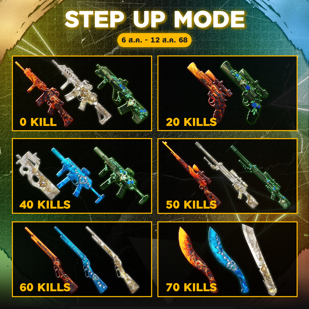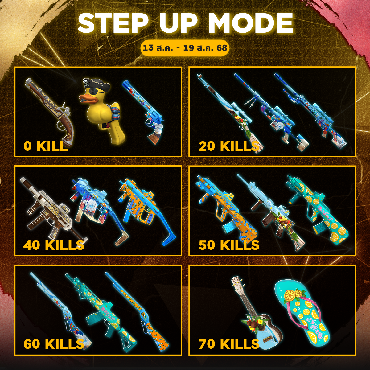 =============================== Step-up Special Summer Weapons Event ระยะเวลากิจกรรม : 13 - 19 สิงหาคม 2568 ทำการเปลี่ยนอาวุธในโหมด Step-up ให้เป็นอาวุธธีมฤดูร้อน กระสุนระอุ