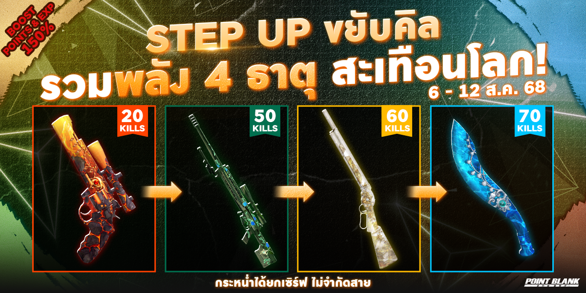 เพิ่มอัตราการได้รับ EXP&Point (All Time Event) สูงถึง 150% สำหรับผู้ที่เข้าเล่นโหมด Step-up =============================== Step-up Special Element Weapons Event ระยะเวลากิจกรรม : 6 - 12 สิงหาคม 2568 ทำการเปลี่ยนอาวุธในโหมด Step-up ให้เป็นอาวุธธีมธาตุต่างๆ (Element of Fire, Element of Nature, Element of Water และ Element of Light)