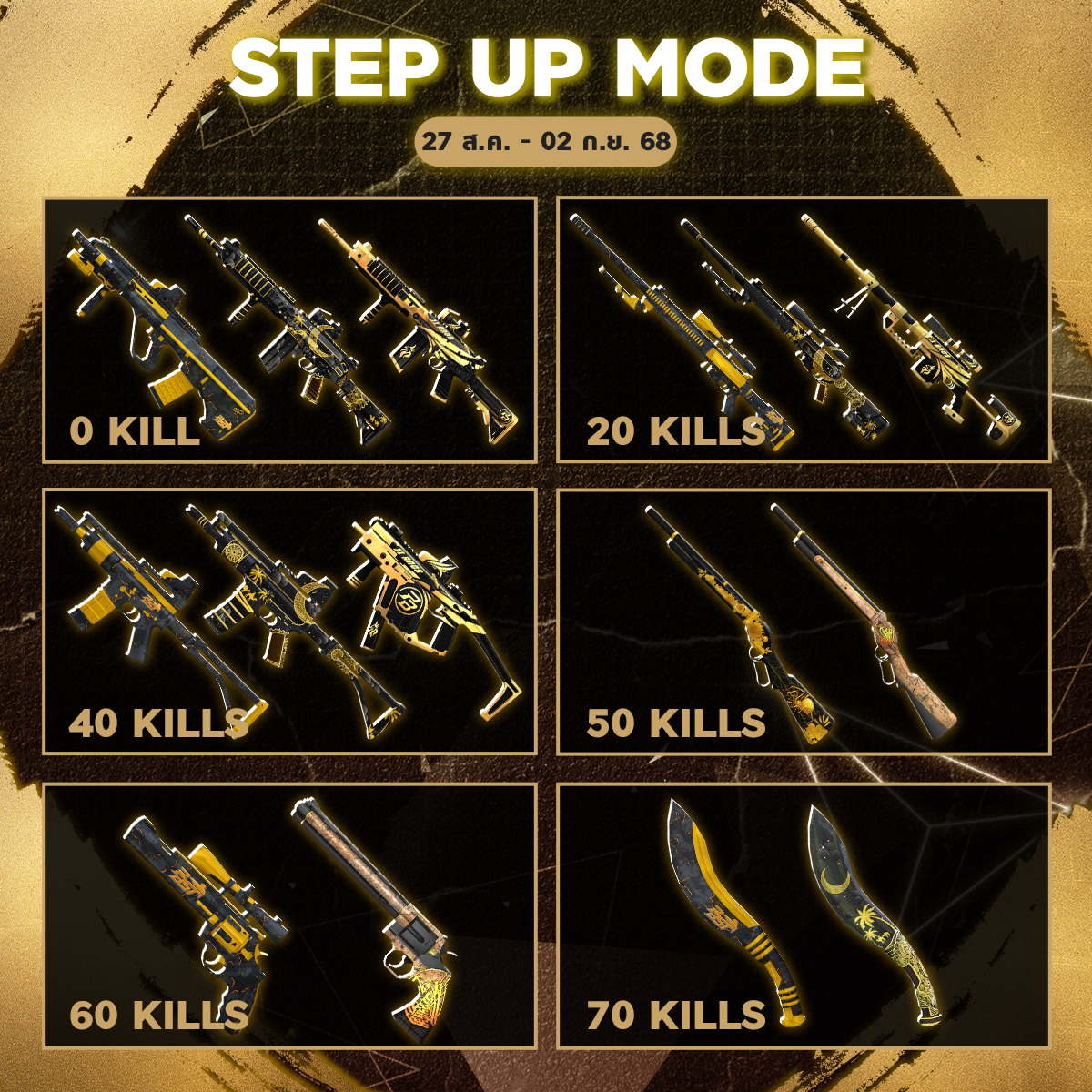 =============================== Step-up Special Golden Weapons Event ระยะเวลากิจกรรม : 27 สิงหาคม - 2 กันยายน 2568 ทำการเปลี่ยนอาวุธในโหมด Step-up ให้เป็นอาวุธสีทองคำ หรูหรา รุนแรง โดยจะแบ่งตามระดับของแต่ละขั้น ดังต่อไปนี้ =============================== |
