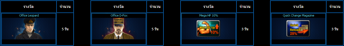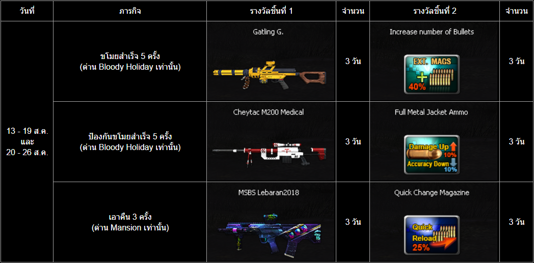 POINT BLANK WEEKLY EVENT UPDATE อัปเดตประจำวันที่ 13 สิงหาคม 2568 รายละเอียดการอัปเดตประจำสัปดาห์ ไฮไลท์ กิจกรรมใหม่ภายในเกม อัปเดต เพิ่มด่าน เปิดแผนที่โหมด Convoy (13 - 26 สิงหาคม 2568) อัปเดต กิจกรรม กิจกรรมพิเศษในโหมด Die Hard (13 - 26 สิงหาคม 2568) อัปเดต กิจกรรม ภารกิจพิเศษในโหมด Convoy (13 - 26 สิงหาคม 2568) อัปเดต กิจกรรม Weapon TRY OUT! (13 - 26 สิงหาคม 2568) อัปเดต กิจกรรม ภารกิจรับ Bonus Point พิเศษ (13 สิงหาคม - 9 กันยายน 2568) อัปเดต กิจกรรม สะสมเวลาล็อกอินประจำวันสุดสัปดาห์เดือนสิงหาคม (15 - 17 สิงหาคม 2568)กิจกรรมที่กำลังดำเนินอยู่ภายในเกม กิจกรรม แจกของรางวัลต้อนรับผู้เล่นใหม่! (6 - 19 สิงหาคม 2568) กิจกรรม ล็อกอินรับไอเทมประจำวัน! (6 - 19 สิงหาคม 2568) กิจกรรม การ์ดภารกิจประจำเดือนสิงหาคม (6 - 19 สิงหาคม 2568) กิจกรรม ล็อกอินต่อเนื่องประจำเดือนสิงหาคม2568 (30 กรกฎาคม - 26 สิงหาคม 2568) ![]() Persian ซีรีส์ ระยะเวลาเปิดจำหน่ายตั้งแต่วันที่ : 13 - 26 สิงหาคม 2568 (ไอเทมจะทำการเปิดจำหน่ายจนถึงระยะเวลาก่อนปิดปรับปรุงเซิร์ฟเวอร์) "พิเศษโบนัส 150% EXP & Point เมื่อใช้อาวุธหลักของซีรีส์ในวันที่ 13 - 19 สิงหาคม 2568" ![]() ![]() ![]() กล่องสุ่ม Pindad SS3 & XM7 Gacha ระยะเวลาเปิดจำหน่ายตั้งแต่วันที่ : 13 - 26 สิงหาคม 2568 (ไอเทมจะทำการเปิดจำหน่ายจนถึงระยะเวลาก่อนปิดปรับปรุงเซิร์ฟเวอร์) *ภาพแสดงไอเทมเพียงบางส่วนผู้เล่นสามารถตรวจสอบของราววัลทั้งหมดได้จากร้านค้าภายในเกม เซ็ต BORA-12 TSR Gold Package ระยะเวลาเปิดจำหน่ายตั้งแต่วันที่ : 13 - 26 สิงหาคม 2568 (ไอเทมจะทำการเปิดจำหน่ายจนถึงระยะเวลาก่อนปิดปรับปรุงเซิร์ฟเวอร์) ![]() กิจกรรม แจกของรางวัลต้อนรับผู้เล่นใหม่! ระยะเวลากิจกรรม : 6 - 19 สิงหาคม 2568 เพียงสมัครและเข้าเกมในช่วงระยะเวลากิจกรรม เพื่อรับของรางวัลตามรายการดังนี้ ![]() กิจกรรม ล็อกอินรับไอเทมประจำวัน! ระยะเวลากิจกรรม : 6 - 19 สิงหาคม 2568 เพียงเข้าเกมในช่วง "ระยะเวลากิจกรรม" เพื่อรับของรางวัลตามรายการ ดังนี้ * ไอเทมทุกชิ้นจากกิจกรรมจะมีอายุการใช้งาน 1 วัน* **ไอเทมจะถูกเปิดใช้งานทันทีเมื่อเข้าตัวหรืออยู่ในคลังอาวุธของผู้เล่น** กิจกรรม ภารกิจพิเศษในโหมด Die Hard Boost EXP&Point ระยะเวลากิจกรรม : 13 - 26 สิงหาคม 2568 เพิ่มอัตราการได้รับ EXP&Point สำหรับการเล่นในโหมด Die Hard สูงถึง 150% ========================================================== กิจกรรม ภารกิจพิเศษในโหมด Convoy ระยะเวลากิจกรรม : 13 - 26 สิงหาคม 2568 เพิ่มภารกิจรายสัปดาห์พิเศษเฉพาะแผนที่ในโหมด Convoy เท่านั้นพร้อมกับของรางวัลสุดพิเศษ ![]() Boost EXP&Point ระยะเวลากิจกรรม : 13 - 26 สิงหาคม 2568 เพิ่มอัตราการได้รับ EXP&Point สำหรับการเล่นในโหมด Convoy สูงถึง 150% ========================================================== กิจกรรม Weapon TRY OUT! ระยะเวลากิจกรรม : 13 - 26 สิงหาคม 2568 กิจกรรมสุดพิเศษให้ผู้เล่นลองใช้อาวุธพิเศษรายวัน ประเภทไรเฟิลจู่โจม เพื