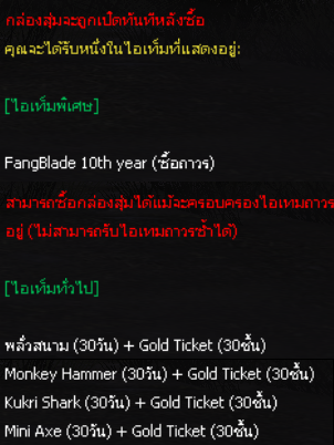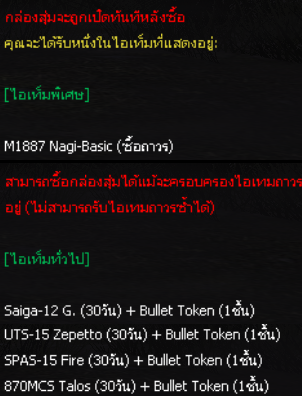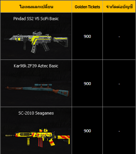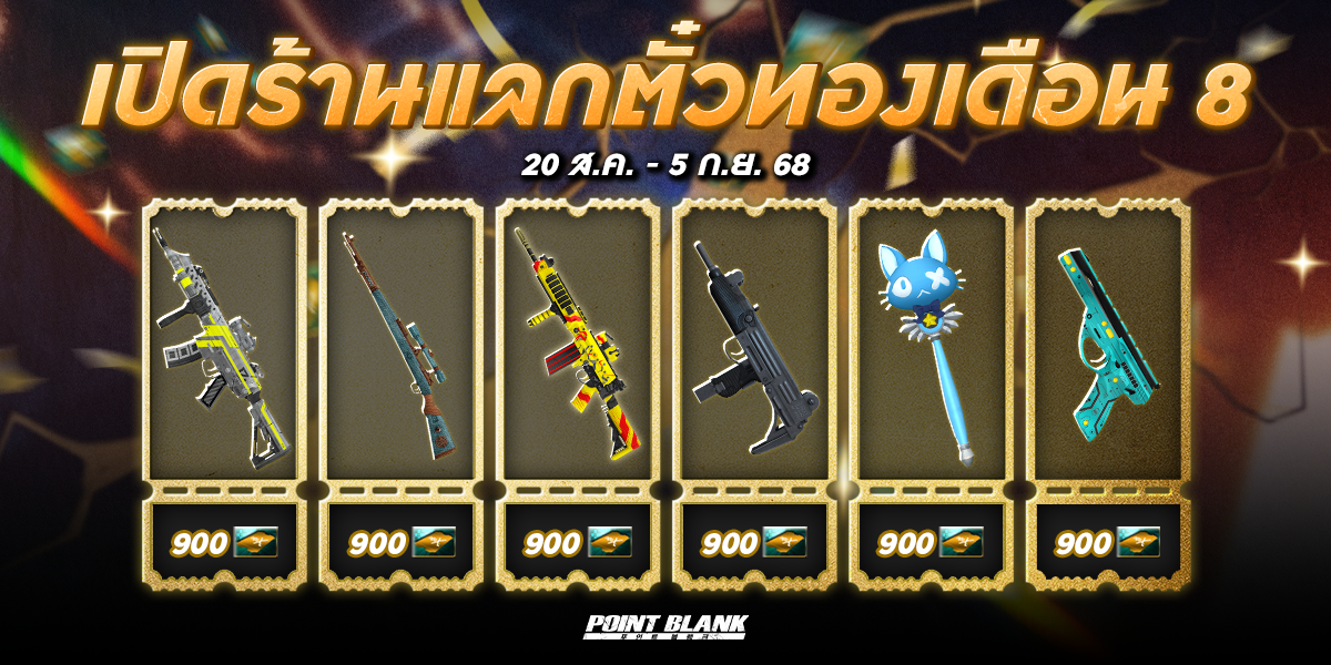 ![]() แลกเปลี่ยน Bullet Token & Golden Ticket ประจำเดือนสิงหาคม 2025 ช่วงเวลากิจกรรม: 20 สิงหาคม - 5 กันยายน 2568 ** รายชื่อกิจกรรม ** M1887 Nagi Ba Dura Box และ FangBlade 10th Year Dura Box [ 20 สิงหาคม - 2 กันยายน 2568 ] เปิดร้านแลกเปลี่ยน Gold Ticket [ 20 สิงหาคม - 5 กันยายน 2568 ] พบกับ! M1887 Nagi Ba Dura Box ระยะเวลาวางจำหน่าย : 20 สิงหาคม - 2 กันยายน 2568 เท่านั้น! พบกับกิจกรรมกล่องสุ่มปืนถาวร! M1887 Nagi-Basic Durability Box มาพร้อมการการันตี 100% เพียงทำตามเงื่อนไขดังต่อไปนี้ เงื่อนไขการแลกเปลี่ยน [M1887 Nagi-Basic (Durability)] ผู้เล่นจำเป็นจะต้องใช้ไอเท็ม Bullet Token ในการแลกเปลี่ยน * ทุกกล่องสุ่ม [ M1887 Nagi-Basic Durability Box ] จะได้รับ Bullet Token 1 ชิ้น ผู้เล่นจำเป็นต้องได้รับ Bullet Token จำนวน 400 ชิ้น เพื่อการันตีรับ M1887 Nagi-Basic (Durability) หลังสิ้นสุดกิจกรรม ผู้เล่นที่มีจำนวน Bullet Token 400 ชิ้นหรือมากกว่าและยังไม่ได้รับ M1887 Nagi-Basic (Durability) จะได้รับ M1887 Nagi-Basic (Durability) เข้ากระเป๋าสัมภาระและหัก Bullet Token 400 ชิ้น สำหรับส่วนต่าง Bullet Token ที่เหลือจะถูกเปลี่ยนให้เป็น Golden Ticket ตามอัตราส่วนที่กำหนด ** ผู้เล่นที่มี M1887 Nagi-Basic (Durability) อยู่แล้วในช่วงเวลาการขายกล่องสุ่ม จะทำการแปลง Bullet Token ให้เป็น Golden Ticket ทันทีหลังวันที่ 2 กันยายน ** *โดยไอเทมจะถูกส่งเข้ากระเป๋าสัมภาระของผู้เล่นหลังจากจบกิจกรรมภายในระยะเวลา 7 วันทำการ* หมายเหตุ หลังจากวันที่ 2 กันยายน 2568 ไอเทม Bullet Token จะถูกเปลี่ยนแทนที่ด้วยไอเทม Gold Ticket แทนเพื่อใช้แลกในกิจกรรม Gold Ticket Exchange โดยอัตราส่วน Bullet Token 1 ชิ้น = Gold Ticket 2 ชิ้น ![]() ![]() *หมายเหตุ ผู้เล่นมีโอกาสรับของรางวัลตามภาพ โดยทุกไอเทมที่ได้รับ จะมีจำนวน 30 / 7 / 3 / 1 วัน ========================================= FangBlade 10th Year Dura Box ระยะเวลาวางจำหน่าย 20 สิงหาคม - 2 กันยายน 2568 พบกับกล่องสุ่มอาวุธประชิดถาวร! FangBlade 10th Year Dura Box มาให้ผู้เล่นทุกท่านได้จับจองเป็นเจ้าของกันแล้ว! [FangBlade 10th Year Dura Box] ![]() ![]() *ทุกกล่องสุ่ม [ FangBlade 10th Year Dura Box ] จะได้รับ Gold Ticket จำนวนเดียวกับจำนวนวันที่ได้รับไอเทม* ตัวอย่างเช่น : ผู้เล่นสุ่มได้ไอเทมจำนวน 30D หรือ 30 วัน จะได้รับ Gold Ticket ในจำนวนเดียวกันคือ 30 Gold Ticket นั่นเอง **ผู้เล่นมีโอกาสรับของรางวัลตามภาพแต่จำนวนวันอาจจะไม่ตรงตามเพราะทุกไอเทมมีทั้งแบบ 30 / 7 / 3 / 1 วัน** ***หมายเหตุ : ไอเทมกล่องสุ่มนี้จะไม่มีการการันตีถาวร*** กลับมาแล้ว!!! กับกิจกรรมสะสม Gold Ticket เพื่อแลกไอเท็มถาวร!!! เงื่อนไขการแลกเปลี่ยน Gold Ticket *จำเป็นต้องใช้ตั๋ว Gold Ticket ในการแลกเปลี่ยน ![]() (Gold Ticket รับได้จากกล่องสุ่มปืนถาวร และ กิจกรรมภายในเกม) 1.มี Gold Ticket ครบ ตามจำนวนที่กำหนด ในช่องกระเป๋าสัมภาระ 2.เมื่อผู้เล่นมีจำนวน Gold Ticket ครบตามกำหนดจะสามารถเข้าไปแลกได้ที่เมนู "PREMIUM SHOP > GOLD TICKET หากเข้าจากหน้าเว็บ" หรือทำตามขั้นตอนต่อไปนี้ กดที่เมนู PREMIUM SHOP ![]() จะเข้ามาหน้า WEB SHOP และให้ทำการกดเมนู GOLD TICKET ทางด้านขวา ![]() จะเข้ามาสู้หน้ารายการ GOLD TICKET SHOP LI