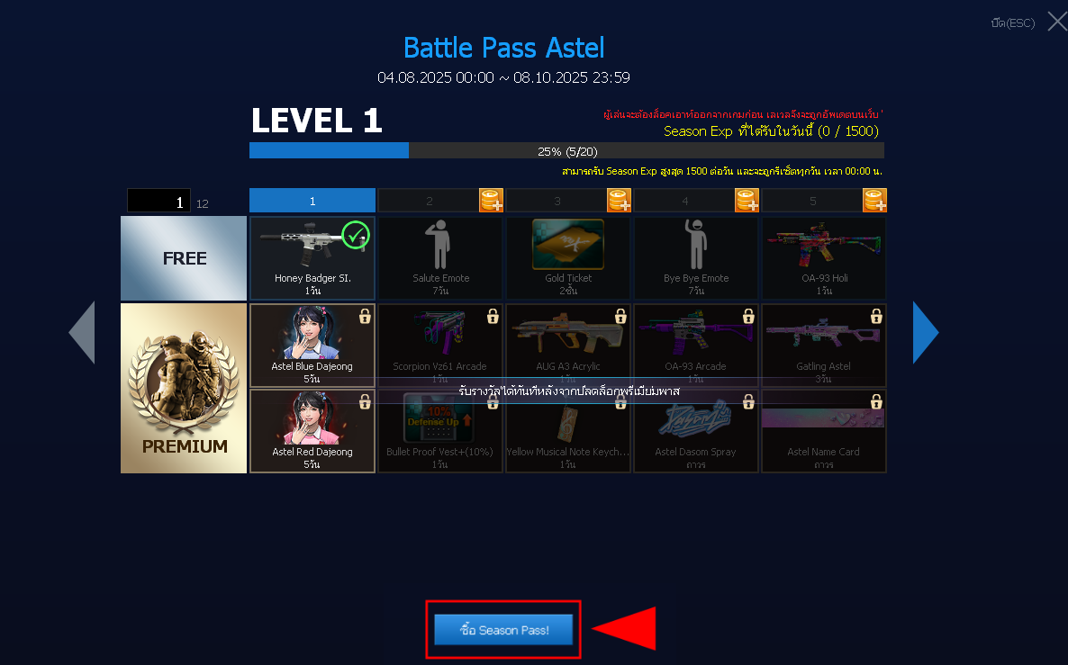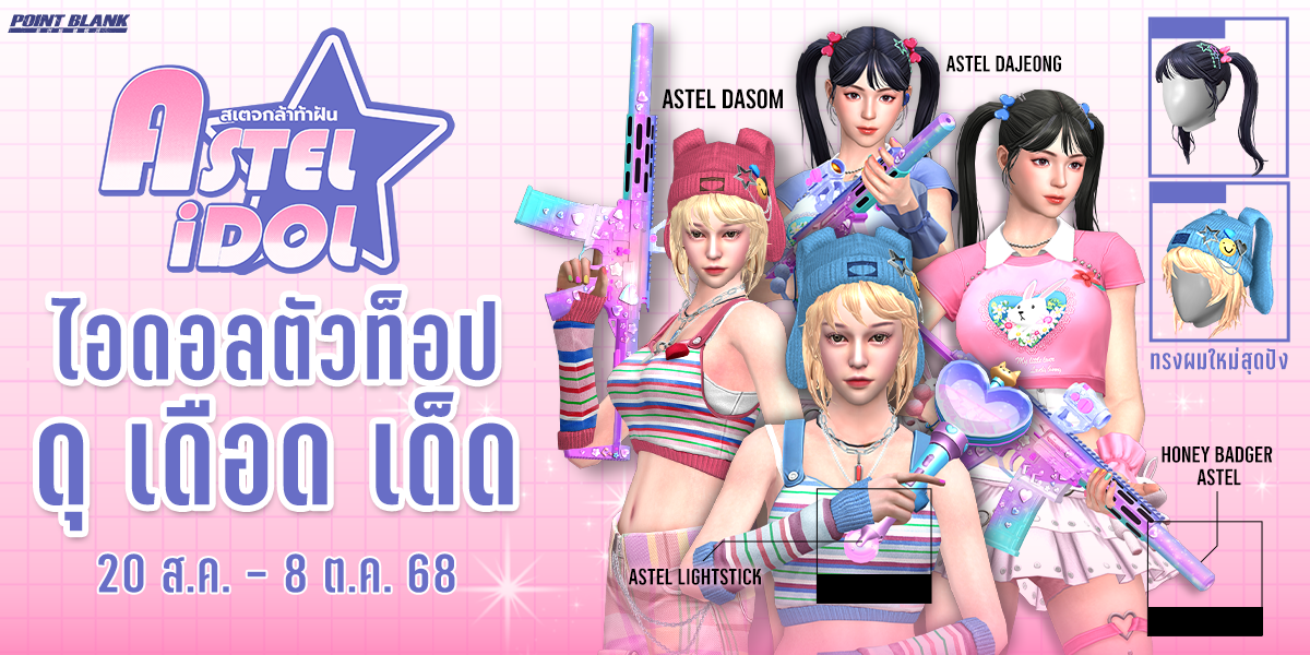 === ขั้นตอนการซื้อ Battle Pass Level ==== ผู้เล่นสามารถดำเนินการซื้อเลเวลของ Battle Pass ด้วย PB Cash ได้ดังนี้ ![]() รูปตัวอย่างหน้าจอ Battle Pass อาวุธหลัก : Honey Badger Astel (ถาวร) เงื่อนไขการครอบครอง: ของรางวัลระดับ Premium ที่ Battle pass เลเวล 45 อาวุธประชิด : Light Stick (ถาวร) - แบบถาวรและแบบจำกัดเวลา สามารถสุ่มได้จาก Random Box (การันตีถาวร 100%) เริ่มเปิดขายวันที่ 20 สิงหาคม - 8 ตุลาคม 2568 ในร้านค้า Battle Pass เงื่อนไขการการันตี Light Stick (ถาวร) 1.ผู้เล่นจะต้องทำการสุ่มกล่องสุ่มให้ครบตามที่กำหนด 600 กล่อง (ในกรณีที่ยังไม่ได้ Light Stick ถาวร) 2.ระบบจะทำการบันทึกข้อมูลผู้เล่นดังกล่าวไว้ โดยอ้างอิงข้อมูลผู้ที่ทำการซื้อครบตั้งแต่วันจันทร์ ถึง วันอาทิตย์ในแต่ละสัปดาห์ 3.ระบบจะมีการส่ง Light Stick (Durability) เข้าไปยังกระเป๋าสัมภาระของผู้เล่นที่ทำการการันตี ทุกวันปิดปรับปรุงเซิฟเวอร์ ==================== ตัวละครถาวรใหม่ : Astel Red Dajeong (ถาวร) ทั้งแบบถาวรและแบบจำกัดเวลา สามารถสุ่มได้จาก Random Box (การันตีถาวร 100%) เริ่มเปิดขายวันที่ 20 สิงหาคม - 8 ตุลาคม 2568 ในร้านค้า Battle Pass Level 1 เงื่อนไขการการันตี Astel Red Dajeong (ถาวร) 1.ผู้เล่นจะต้องทำการสุ่มกล่องสุ่มให้ครบตามที่กำหนด 400 กล่อง (ในกรณีที่ยังไม่ได้ Astel Red Dajeong (ถาวร)) 2.ระบบจะทำการบันทึกข้อมูลผู้เล่นดังกล่าวไว้ โดยอ้างอิงข้อมูลผู้ที่ทำการซื้อครบตั้งแต่วันจันทร์ ถึง วันอาทิตย์ในแต่ละสัปดาห์ 3.ระบบจะมีการส่ง Astel Red Dajeong (ถาวร) เข้าไปยังกระเป๋าสัมภาระของผู้เล่นที่ทำการการันตี ทุกวันปิดปรับปรุงเซิฟเวอร์ ======================= ตัวละครถาวรใหม่ : Astel Blue Dajeong (ถาวร) ทั้งแบบถาวรและแบบจำกัดเวลา สามารถสุ่มได้จาก Random Box (การันตีถาวร 100%) เริ่มเปิดขายวันที่ 20 สิงหาคม - 8 ตุลาคม 2568 ในร้านค้า Battle Pass Level 1 เงื่อนไขการการันตี Astel Blue Dajeong (ถาวร) 1.ผู้เล่นจะต้องทำการสุ่มกล่องสุ่มให้ครบตามที่กำหนด 400 กล่อง (ในกรณีที่ยังไม่ได้ Astel Blue Dajeong (ถาวร)) 2.ระบบจะทำการบันทึกข้อมูลผู้เล่นดังกล่าวไว้ โดยอ้างอิงข้อมูลผู้ที่ทำการซื้อครบตั้งแต่วันจันทร์ ถึง วันอาทิตย์ในแต่ละสัปดาห์ 3.ระบบจะมีการส่ง Astel Blue Dajeong (ถาวร) เข้าไปยังกระเป๋าสัมภาระของผู้เล่นที่ทำการการันตี ทุกวันปิดปรับปรุงเซิฟเวอร์ ======================= และสำหรับผู้ที่สะสม Astel Red Dajeong (ถาวร) และ Astel Blue Dajeong (ถาวร) ครบถ้วนทั้งคู่จะได้รับ Astel Dajeong Spray (ถาวร) ทุกวันปิดปรับปรุงเซิฟเวอร์ ตัวละคร Battle Pass : Astel มีตัวละครหลักด้วยกัน 2 ตัว คือ Astel Red Dasom (ถาวร) (HP 100) และ Astel Blue Dasom (ถาวร) (HP 100) เงื่อนไขการครอบครอง: ของรางวัลระดับ Premium Battle Pass เลเวล 30 ![]() ![]() ![]() ![]() ==================== Astel Name Card & Master Name Card & Astel Dasom Spray ![]() ![]() ![]() หมายเหตุ