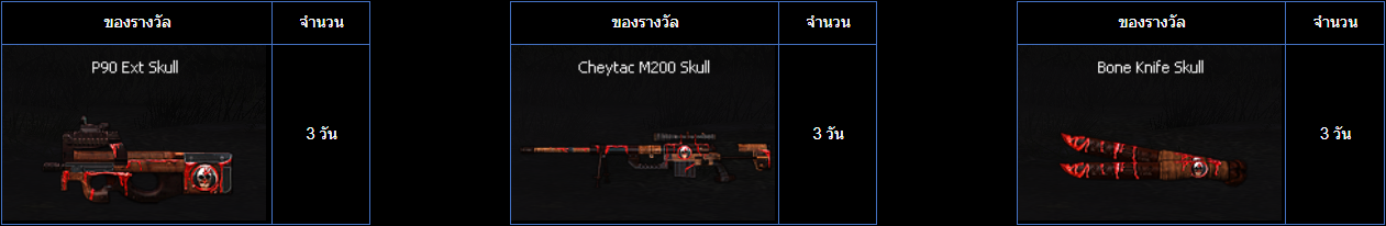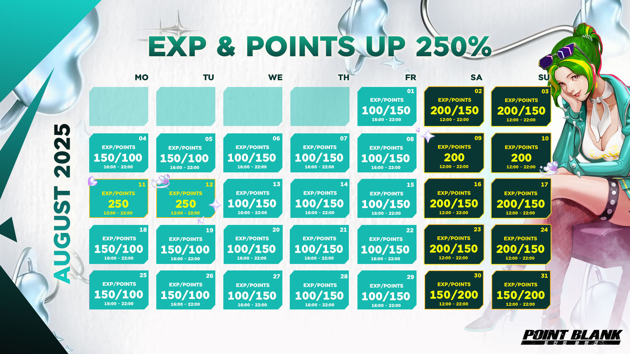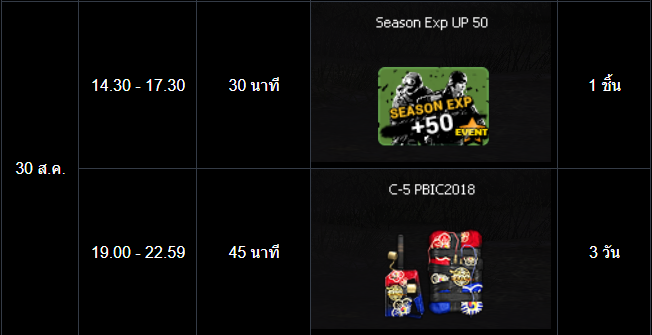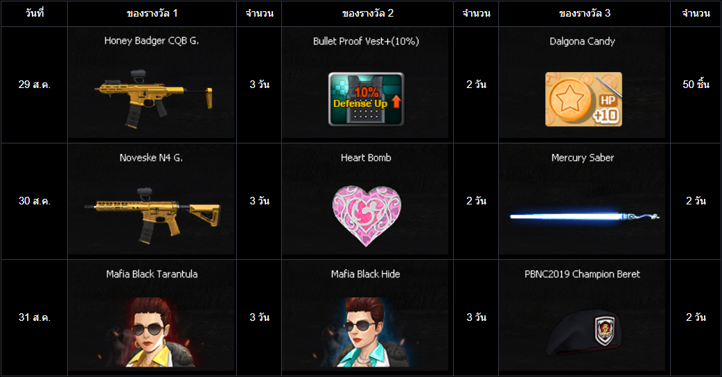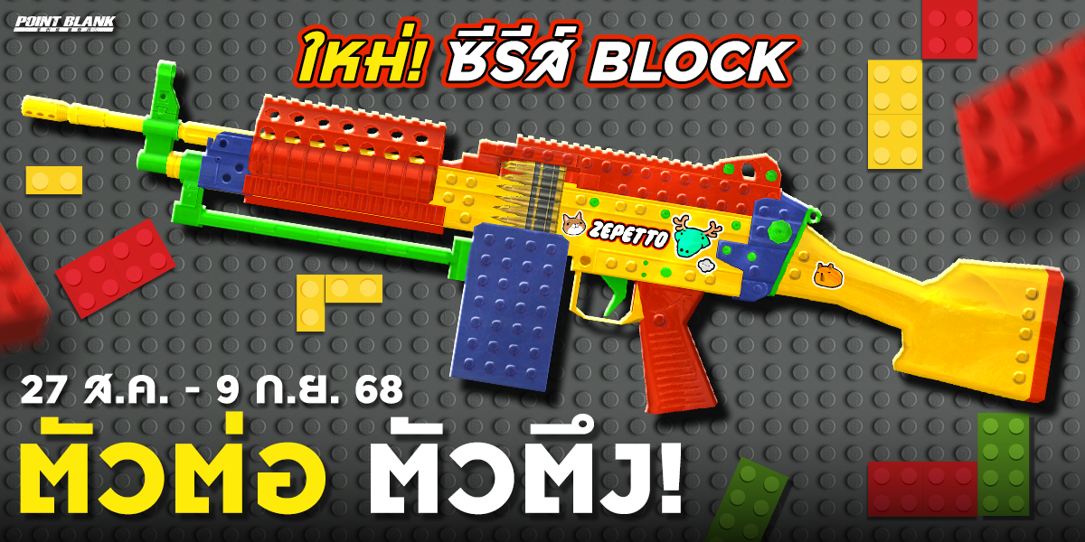 POINT BLANK WEEKLY EVENT UPDATE อัปเดตประจำวันที่ 27 สิงหาคม 2568 ไฮไลท์ประจำสัปดาห์ เปิด Battle Pass: Astel Idol สเตจกล้าท้าฝัน ให้ทุกท่านได้สัมผัสแล้ววันนี้! ดูรายละเอียดเพิ่มเติมได้ที่นี่ กิจกรรมใหม่ภายในเกม อัปเดต กิจกรรม ล็อกอินทดลอง Sniper Rebalance! (27 สิงหาคม - 2 กันยายน 2568) อัปเดต กิจกรรม ล็อกอินพิเศษสุดสัปดาห์ (29 - 31 สิงหาคม 2568) อัปเดต กิจกรรม บูสต์แต้มแคลน (27 สิงหาคม - 9 กันยายน 2568) อัปเดต กิจกรรม ล็อกอินสะสมต่อเนื่อง ประจำเดือนกันยายน รอบที่ 1 2568 (27 สิงหาคม - 16 กันยายน 2568) อัปเดต กิจกรรม สะสมเวลาล็อกอินประจำวันสุดสัปดาห์เดือนสิงหาคม (29 - 31 สิงหาคม 2568) กิจกรรมที่กำลังดำเนินอยู่ภายในเกม กิจกรรม แจกของรางวัลต้อนรับผู้เล่นใหม่! (20 สิงหาคม - 2 กันยายน 2568) กิจกรรม ล็อกอินรับไอเทมประจำวัน! (20 สิงหาคม - 2 กันยายน 2568) กิจกรรม การ์ดภารกิจ Astel Idol 1 (20 สิงหาคม - 2 กันยายน 2568) กิจกรรม ภารกิจพิเศษรับ Bonus Point พิเศษ (13 สิงหาคม - 9 กันยายน 2568) ![]() Block ซีรีส์ ระยะเวลาเปิดจำหน่ายตั้งแต่วันที่ : 27 สิงหาคม - 9 กันยายน 2568 (ไอเทมจะทำการเปิดจำหน่ายจนถึงระยะเวลาก่อนปิดปรับปรุงเซิร์ฟเวอร์) "พิเศษโบนัส 150% EXP & Point เมื่อใช้อาวุธหลักของซีรีส์" ![]() ![]() ![]() กล่องสุ่ม Silence Weapon Gacha V3 ระยะเวลาเปิดจำหน่ายตั้งแต่วันที่ : 27 สิงหาคม - 9 กันยายน 2568 (ไอเทมจะทำการเปิดจำหน่ายจนถึงระยะเวลาก่อนปิดปรับปรุงเซิร์ฟเวอร์) *ภาพแสดงไอเทมเพียงบางส่วนผู้เล่นสามารถตรวจสอบของราววัลทั้งหมดได้จากร้านค้าภายในเกม ======================= กล่องสุ่ม Barrett M82A1 Durability Box ระยะเวลาเปิดจำหน่ายตั้งแต่วันที่ : 27 สิงหาคม - 2 กันยายน 2568 (ไอเทมจะทำการเปิดจำหน่ายจนถึงระยะเวลาก่อนปิดปรับปรุงเซิร์ฟเวอร์) *ภาพแสดงไอเทมเพียงบางส่วนผู้เล่นสามารถตรวจสอบของราววัลทั้งหมดได้จากร้านค้าภายในเกม เซ็ต Famous Mask Package 7D ระยะเวลาเปิดจำหน่ายตั้งแต่วันที่ : 27 สิงหาคม - 9 กันยายน 2568 (ไอเทมจะทำการเปิดจำหน่ายจนถึงระยะเวลาก่อนปิดปรับปรุงเซิร์ฟเวอร์) ![]() กิจกรรม แจกของรางวัลต้อนรับผู้เล่นใหม่! ระยะเวลากิจกรรม : 20 สิงหาคม - 2 กันยายน 2568 เพียงสมัครและเข้าเกมในช่วงระยะเวลากิจกรรม เพื่อรับของรางวัลตามรายการดังนี้ ![]() กิจกรรม ล็อกอินรับไอเทมประจำวัน! ระยะเวลากิจกรรม : 20 สิงหาคม - 2 กันยายน 2568 เพียงเข้าเกมในช่วง "ระยะเวลากิจกรรม" เพื่อรับของรางวัลตามรายการ ดังนี้ * ไอเทมทุกชิ้นจากกิจกรรมจะมีอายุการใช้งาน 1 วัน* **ไอเทมจะถูกเปิดใช้งานทันทีเมื่อเข้าตัวหรืออยู่ในคลังอาวุธของผู้เล่น** การ์ดภารกิจ Astel Idol 1 ระยะเวลากิจกรรม : 20 สิงหาคม - 2 กันยายน 2568 พบกับ การ์ดภารกิจประจำ Battle Pass: Astel idol มาพร้อมกับไอเทมมากมาย ดังนี้ รางวัลต่างๆที่สามารถรับได้จากบัตรภารกิจ การ์ดภารกิจ Astel Idol 1 กิจกรรมพิเศ