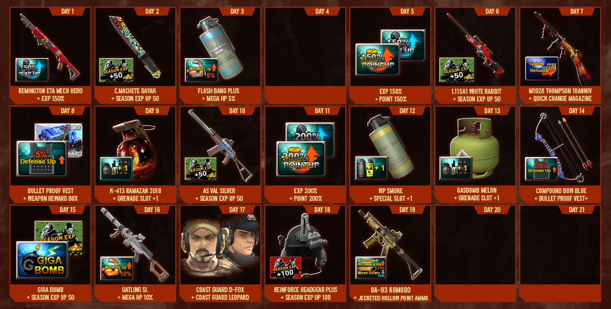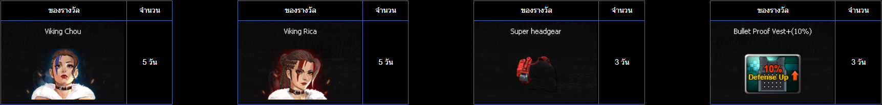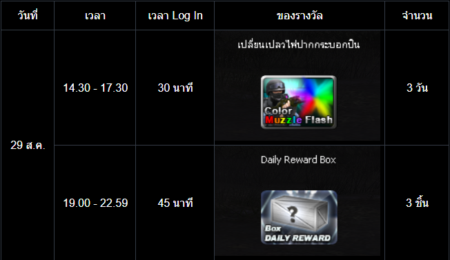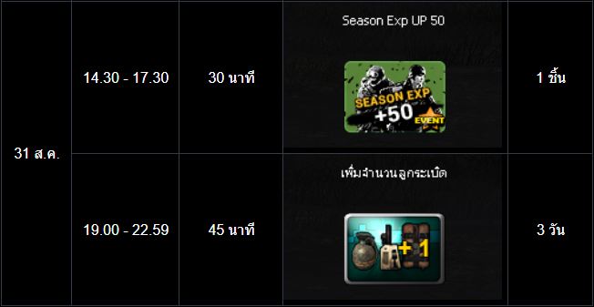 ช่วงกิจกรรมบูสต์แต้มแคลน การเล่นในเซิฟเวอร์ปกติ จะได้เหรียญแคลน คิดเป็น 5% จาก Exp ที่ได้รับ เช่น : 100 EXP = 5 Clan Medal *สามารถ Login และออนไลน์ในเกม เพื่อรับ Clan Medal ได้ 5 เหรียญ = ทุกๆ Login เป็นเวลา 30 นาที (ไม่จำกัดจำนวนครั้ง) ======================= ตาราง ล็อกอินต่อเนื่อง ประจำเดือนกันยายน ครั้งที่ 1 2568 ระยะเวลากิจกรรม : 27 สิงหาคม - 16 กันยายน 2568 เพียงล็อกอินเข้าเกมในช่วงระยะเวลากิจกรรมเพื่อรับไอเทมดังต่อไปนี้ ตารางโบนัส EXP & Point ประจำเดือนสิงหาคม 2568 |