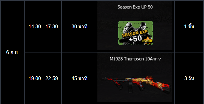 ช่วงกิจกรรมบูสต์แต้มแคลน การเล่นในเซิฟเวอร์ปกติ จะได้เหรียญแคลน คิดเป็น 5% จาก Exp ที่ได้รับ เช่น : 100 EXP = 5 Clan Medal *สามารถ Login และออนไลน์ในเกม เพื่อรับ Clan Medal ได้ 5 เหรียญ = ทุกๆ Login เป็นเวลา 30 นาที (ไม่จำกัดจำนวนครั้ง) ======================= ตาราง ล็อกอินต่อเนื่อง ประจำเดือนกันยายน ครั้งที่ 1 2568 ระยะเวลากิจกรรม : 27 สิงหาคม - 16 กันยายน 2568 เพียงล็อกอินเข้าเกมในช่วงระยะเวลากิจกรรมเพื่อรับไอเทมดังต่อไปนี้ ตารางโบนัส EXP & Point ประจำเดือนกันยายน 2568 |