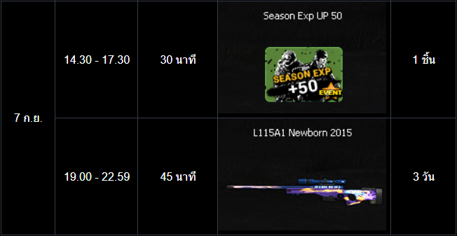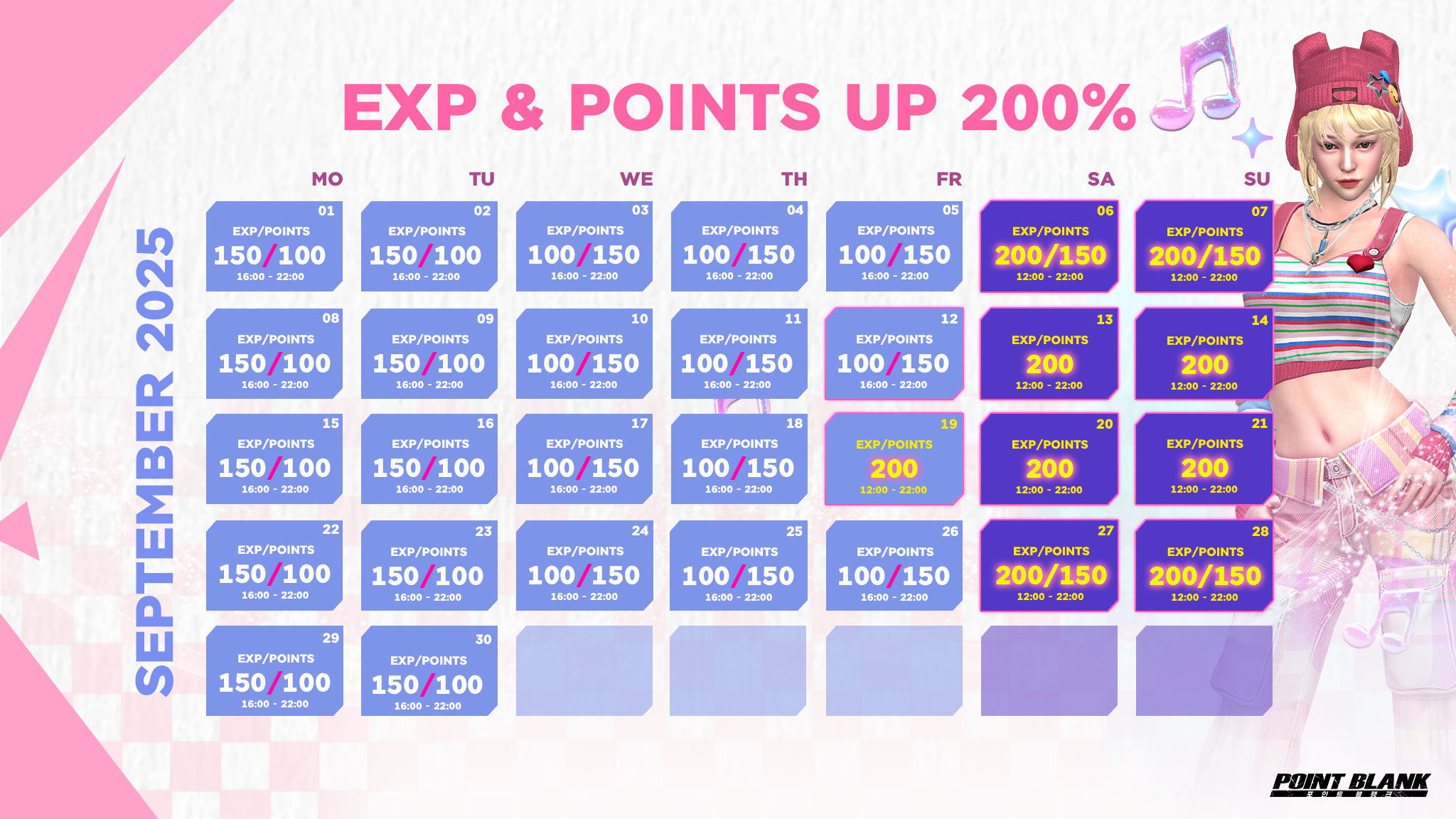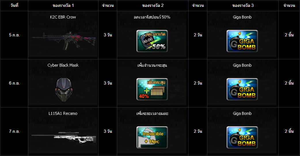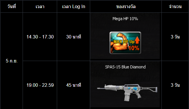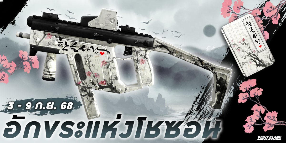 POINT BLANK WEEKLY EVENT UPDATE อัปเดตประจำวันที่ 3 กันยายน 2568 ไฮไลท์ประจำสัปดาห์ กิจกรรมและภารกิจพิเศษในโหมด สงครามชิงพื้นที่ พร้อมให้สัมผัสแล้ววันนี้! ดูรายละเอียดเพิ่มเติมได้ที่นี่ เปิด Battle Pass: Astel Idol สเตจกล้าท้าฝัน ให้ทุกท่านได้สัมผัสแล้ววันนี้! ดูรายละเอียดเพิ่มเติมได้ที่นี่ กิจกรรมใหม่ภายในเกม อัปเดต กิจกรรม แจกของรางวัลต้อนรับผู้เล่นใหม่! (3 - 16 กันยายน 2568) อัปเดต กิจกรรม ล็อกอินรับไอเทมประจำวัน! (3 - 16 กันยายน 2568) อัปเดต กิจกรรม การ์ดภารกิจ Astel Idol 2 (3 - 16 กันยายน 2568) อัปเดต กิจกรรม สะสมเวลาล็อกอินประจำวันสุดสัปดาห์เดือนกันยายน (5 - 7 กันยายน 2568) กิจกรรมที่กำลังดำเนินอยู่ภายในเกม กิจกรรม บูสต์แต้มแคลน (27 สิงหาคม - 9 กันยายน 2568) กิจกรรม ล็อกอินสะสมต่อเนื่อง ประจำเดือนกันยายน รอบที่ 1 2568 (27 สิงหาคม - 16 กันยายน 2568) กิจกรรม ภารกิจพิเศษรับ Bonus Point พิเศษ (13 สิงหาคม - 9 กันยายน 2568) ![]() Hangul 2019 ซีรีส์ ระยะเวลาเปิดจำหน่ายตั้งแต่วันที่ : 3 - 9 กันยายน 2568 (ไอเทมจะทำการเปิดจำหน่ายจนถึงระยะเวลาก่อนปิดปรับปรุงเซิร์ฟเวอร์) "พิเศษโบนัส 150% EXP & Point เมื่อใช้อาวุธหลักของซีรีส์" ![]() ![]() ![]() กล่องสุ่ม HP Accessory ระยะเวลาเปิดจำหน่ายตั้งแต่วันที่ : 3 - 16 กันยายน 2568 (ไอเทมจะทำการเปิดจำหน่ายจนถึงระยะเวลาก่อนปิดปรับปรุงเซิร์ฟเวอร์) *ภาพแสดงไอเทมเพียงบางส่วนผู้เล่นสามารถตรวจสอบของราววัลทั้งหมดได้จากร้านค้าภายในเกม เซ็ต Wig Package A ระยะเวลาเปิดจำหน่ายตั้งแต่วันที่ : 3 - 16 กันยายน 2568 (ไอเทมจะทำการเปิดจำหน่ายจนถึงระยะเวลาก่อนปิดปรับปรุงเซิร์ฟเวอร์) ![]() กิจกรรม แจกของรางวัลต้อนรับผู้เล่นใหม่! ระยะเวลากิจกรรม : 3 - 16 กันยายน 2568 เพียงสมัครและเข้าเกมในช่วงระยะเวลากิจกรรม เพื่อรับของรางวัลตามรายการดังนี้ ![]() กิจกรรม ล็อกอินรับไอเทมประจำวัน! ระยะเวลากิจกรรม : 3 - 16 กันยายน 2568 เพียงเข้าเกมในช่วง "ระยะเวลากิจกรรม" เพื่อรับของรางวัลตามรายการ ดังนี้ * ไอเทมทุกชิ้นจากกิจกรรมจะมีอายุการใช้งาน 1 วัน* **ไอเทมจะถูกเปิดใช้งานทันทีเมื่อเข้าตัวหรืออยู่ในคลังอาวุธของผู้เล่น** การ์ดภารกิจ Astel Idol 2 ระยะเวลากิจกรรม : 3 - 16 กันยายน 2568 พบกับ การ์ดภารกิจประจำเดือนสิงหาคม มาพร้อมกับไอเทมมากมาย ดังนี้ รางวัลต่างๆที่สามารถรับได้จากบัตรภารกิจ การ์ดภารกิจ Astel Idol 2 กิจกรรม ล็อกอินพิเศษสุดสัปดาห์ ระยะเวลากิจกรรม : 5 - 7 กันยายน 2568 เพียงเข้าเกมในช่วงสุดสัปดาห์ เพื่อรับของรางวัลสุดพิเศษตามรายการ ดังนี้ ======================= กิจกรรม สะสมเวลาล็อกอินสุดสัปดาห์ประจำเดือนกันยายน 2568 ระยะเวลากิจกรรม : 5 - 7 กันยายน 2568 เพียงเข้าเกมและสะสมเวลาออนไลน์ให้ครบตามที่กำหนดเวลาในช่วง "ระยะเวลากิจกรรม" เพื่อรับรางว