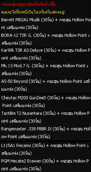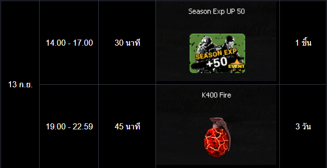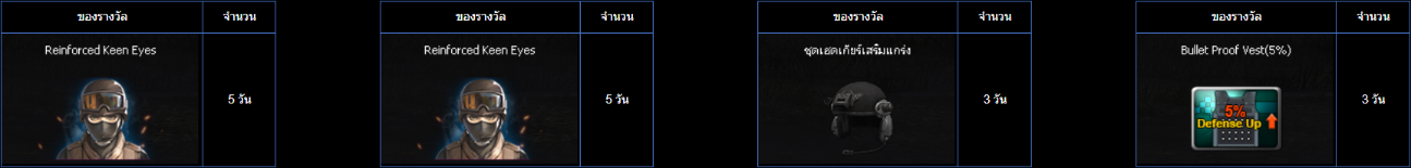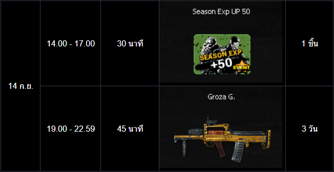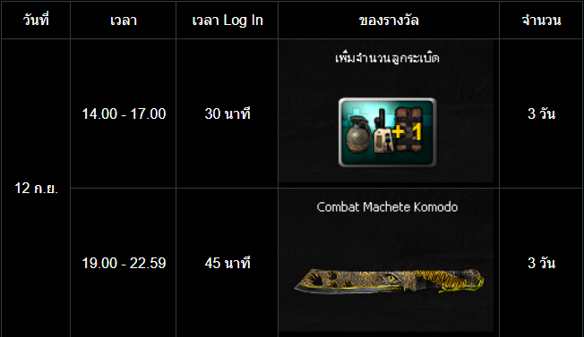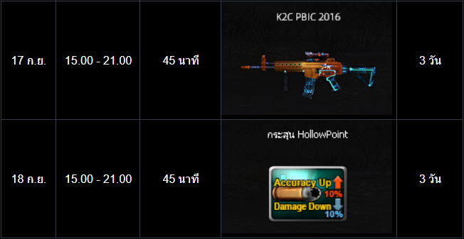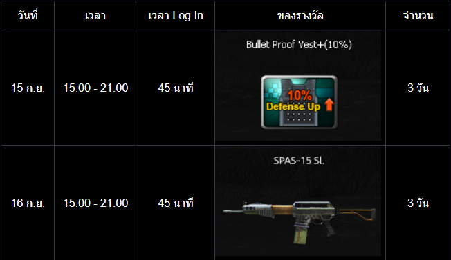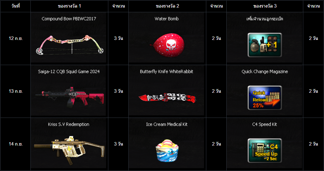 POINT BLANK WEEKLY EVENT UPDATE อัปเดตประจำวันที่ 10 กันยายน 2568 ไฮไลท์ประจำสัปดาห์ ห้ามพลาด! ภารกิจพิเศษในโหมด สงครามชิงพื้นที่ เข้าสู่สัปดาห์สุดท้ายแล้ว! ดูรายละเอียดเพิ่มเติมได้ที่นี่ เปิด Battle Pass: Astel Idol สเตจกล้าท้าฝัน ให้ทุกท่านได้สัมผัสแล้ววันนี้! ดูรายละเอียดเพิ่มเติมได้ที่นี่ กิจกรรมใหม่ภายในเกม อัปเดต กิจกรรม Weapon TRY OUT! ปืนลูกซอง!! (12 - 16 กันยายน 2568) อัปเดต กิจกรรม กิจกรรม Battle Box & Battle Tag Event (10 - 16 กันยายน 2568) อัปเดต กิจกรรม สะสมเวลาล็อกอินประจำวันสุดสัปดาห์เดือนกันยายน (12 - 14 กันยายน 2568) อัปเดต กิจกรรม สะสมเวลาล็อกอินระหว่างสัปดาห์เดือนกันยายน (15 - 18 กันยายน 2568) กิจกรรมที่กำลังดำเนินอยู่ภายในเกม กิจกรรม แจกของรางวัลต้อนรับผู้เล่นใหม่! (3 - 16 กันยายน 2568) กิจกรรม ล็อกอินรับไอเทมประจำวัน! (3 - 16 กันยายน 2568) กิจกรรม การ์ดภารกิจ Astel Idol 2 (3 - 16 กันยายน 2568) กิจกรรม ล็อกอินสะสมต่อเนื่อง ประจำเดือนกันยายน รอบที่ 1 2568 (27 สิงหาคม - 16 กันยายน 2568) ![]() Wildcat ซีรีส์ ระยะเวลาเปิดจำหน่ายตั้งแต่วันที่ : 10 - 23 กันยายน 2568 (ไอเทมจะทำการเปิดจำหน่ายจนถึงระยะเวลาก่อนปิดปรับปรุงเซิร์ฟเวอร์) "พิเศษโบนัส 150% EXP & Point เมื่อใช้อาวุธหลักของซีรีส์" ![]() ![]() ![]() กล่องสุ่ม Extreme Sniper Plus ระยะเวลาเปิดจำหน่ายตั้งแต่วันที่ : 10 - 23 กันยายน 2568 (ไอเทมจะทำการเปิดจำหน่ายจนถึงระยะเวลาก่อนปิดปรับปรุงเซิร์ฟเวอร์) *ภาพแสดงไอเทมเพียงบางส่วนผู้เล่นสามารถตรวจสอบของราววัลทั้งหมดได้จากร้านค้าภายในเกม เซ็ต AUG A3 Element Fire ระยะเวลาเปิดจำหน่ายตั้งแต่วันที่ : 10 - 23 กันยายน 2568 (ไอเทมจะทำการเปิดจำหน่ายจนถึงระยะเวลาก่อนปิดปรับปรุงเซิร์ฟเวอร์) ![]() ![]() กิจกรรม แจกของรางวัลต้อนรับผู้เล่นใหม่! ระยะเวลากิจกรรม : 3 - 16 กันยายน 2568 เพียงสมัครและเข้าเกมในช่วงระยะเวลากิจกรรม เพื่อรับของรางวัลตามรายการดังนี้ ![]() กิจกรรม ล็อกอินรับไอเทมประจำวัน! ระยะเวลากิจกรรม : 3 - 16 กันยายน 2568 เพียงเข้าเกมในช่วง "ระยะเวลากิจกรรม" เพื่อรับของรางวัลตามรายการ ดังนี้ * ไอเทมทุกชิ้นจากกิจกรรมจะมีอายุการใช้งาน 1 วัน* **ไอเทมจะถูกเปิดใช้งานทันทีเมื่อเข้าตัวหรืออยู่ในคลังอาวุธของผู้เล่น** การ์ดภารกิจ Astel Idol 2 ระยะเวลากิจกรรม : 3 - 16 กันยายน 2568 พบกับ การ์ดภารกิจประจำเดือนสิงหาคม มาพร้อมกับไอเทมมากมาย ดังนี้ รางวัลต่างๆที่สามารถรับได้จากบัตรภารกิจ การ์ดภารกิจ Astel Idol 2 กิจกรรม ล็อกอินพิเศษสุดสัปดาห์ ระยะเวลากิจกรรม : 12 - 14 กันยายน 2568 เพียงเข้าเกมในช่วงสุดสัปดาห์ เพื่อรับของรางวัลสุดพิเศษตามรายการ ดังนี้ ======================= กิจกรรม Weapon TRY OUT! ปืนลูกซอง! ระยะเวลากิจกรรม : 12 - 16 กันยายน 2568 กิจกรรมสุดพิเศษให้ผู้เล่นลองใช้อาวุธปืนพิเศษรายวัน ประเภทปืนลูกซ
