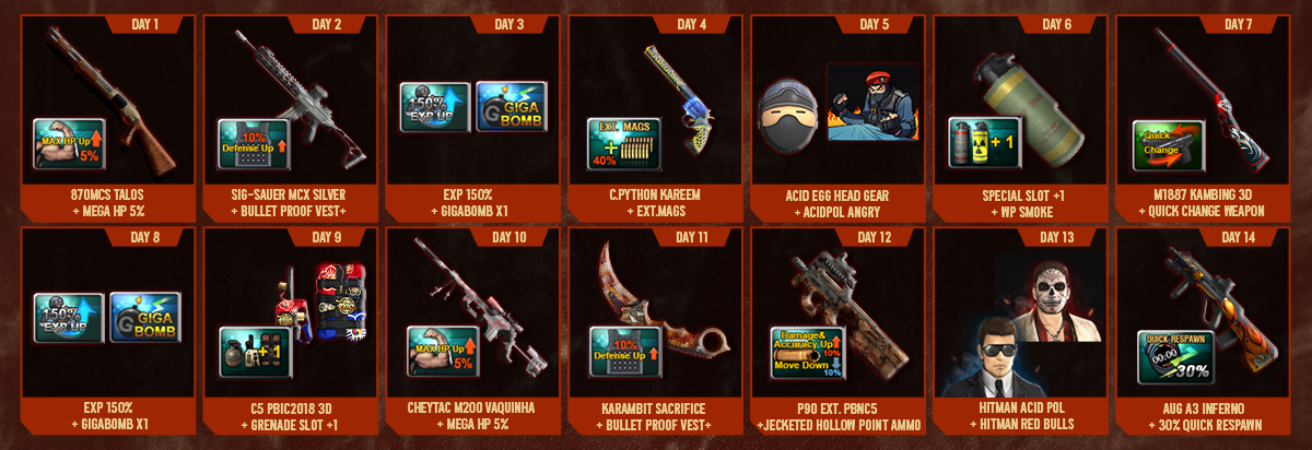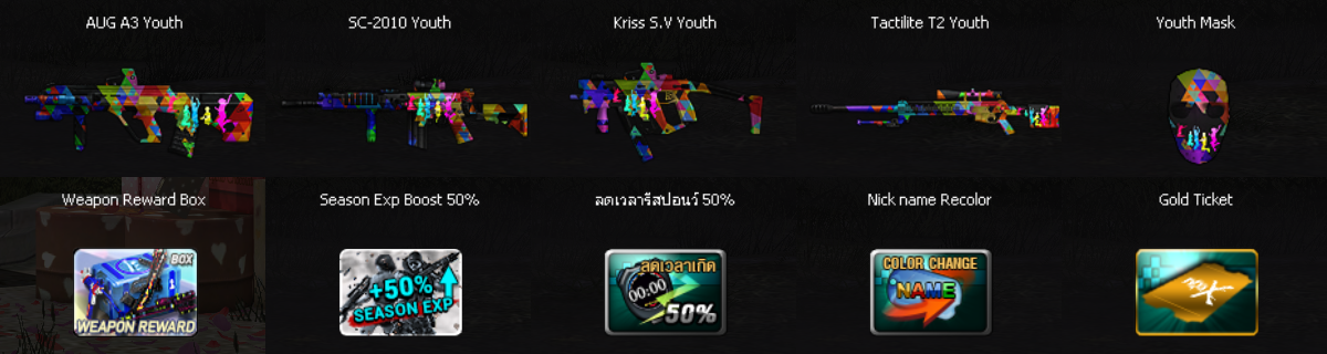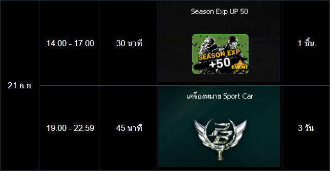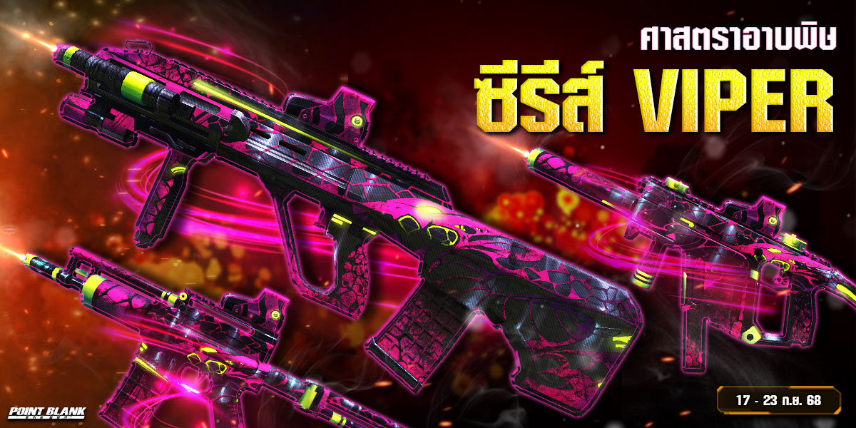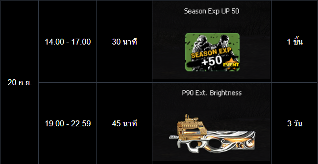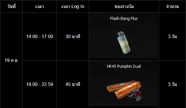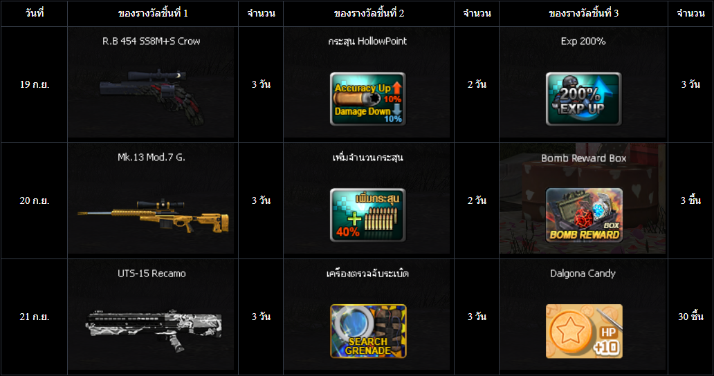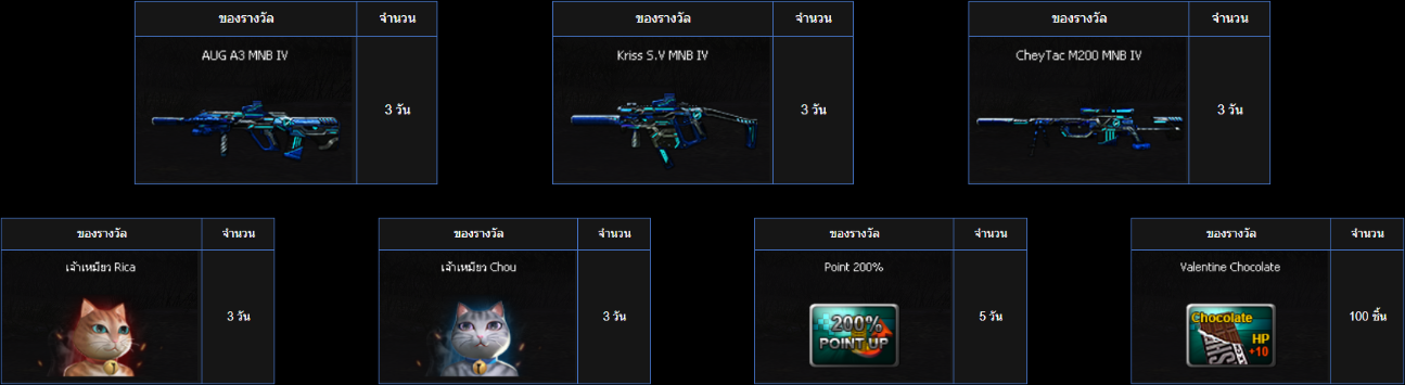 POINT BLANK WEEKLY EVENT UPDATE อัปเดตประจำวันที่ 17 กันยายน 2568 ไฮไลท์ประจำสัปดาห์ เปิด Battle Pass: Astel Idol สเตจกล้าท้าฝัน ให้ทุกท่านได้สัมผัสแล้ววันนี้! ดูรายละเอียดเพิ่มเติมได้ที่นี่ กิจกรรมใหม่ภายในเกม อัปเดต กิจกรรม ล็อกอินรับไอเทมประจำวัน! (17 กันยายน - 7 ตุลาคม 2568) อัปเดต กิจกรรม การ์ดภารกิจ Astel Idol 3 (17 - 30 กันยายน 2568) อัปเดต กิจกรรม ล็อกอินรับไอเทมสุดสัปดาห์ (19 - 21 กันยายน 2568) อัปเดต กิจกรรม สะสมเวลาล็อกอินประจำวันสุดสัปดาห์เดือนกันยายน (19 - 21 กันยายน 2568) กิจกรรมที่กำลังดำเนินอยู่ภายในเกม กิจกรรม สะสมเวลาล็อกอินระหว่างสัปดาห์เดือนกันยายน (15 - 18 กันยายน 2568) ![]() Viper ซีรีส์ ระยะเวลาเปิดจำหน่ายตั้งแต่วันที่ : 17 - 23 กันยายน 2568 (ไอเทมจะทำการเปิดจำหน่ายจนถึงระยะเวลาก่อนปิดปรับปรุงเซิร์ฟเวอร์) "พิเศษโบนัส 150% EXP & Point เมื่อใช้อาวุธหลักของซีรีส์" ![]() ![]() ![]() ![]() กล่องสุ่ม X-MAS2023 ระยะเวลาเปิดจำหน่ายตั้งแต่วันที่ : 17 - 30 กันยายน 2568 (ไอเทมจะทำการเปิดจำหน่ายจนถึงระยะเวลาก่อนปิดปรับปรุงเซิร์ฟเวอร์) *ภาพแสดงไอเทมเพียงบางส่วนผู้เล่นสามารถตรวจสอบของราววัลทั้งหมดได้จากร้านค้าภายในเกม เซ็ต Pindad SS2 Element Nature ระยะเวลาเปิดจำหน่ายตั้งแต่วันที่ : 17 - 30 กันยายน 2568 (ไอเทมจะทำการเปิดจำหน่ายจนถึงระยะเวลาก่อนปิดปรับปรุงเซิร์ฟเวอร์) ![]() กิจกรรม แจกของรางวัลต้อนรับผู้เล่นใหม่! ระยะเวลากิจกรรม : 17 กันยายน - 7 ตุลาคม 2568 ทั้งนี้ยังมีกิจกรรมต้อนรับปิดเทอมอีกมากมาย รายละเอียดเพิ่มเติม: คลิกที่นี่ ![]() กิจกรรม ล็อกอินรับไอเทมประจำวัน! ระยะเวลากิจกรรม : 17 กันยายน - 7 ตุลาคม 2568 เพียงเข้าเกมในช่วง "ระยะเวลากิจกรรม" เพื่อรับของรางวัลตามรายการ ดังนี้ * ไอเทมทุกชิ้นจากกิจกรรมจะมีอายุการใช้งาน 1 วัน* **ไอเทมจะถูกเปิดใช้งานทันทีเมื่อเข้าตัวหรืออยู่ในคลังอาวุธของผู้เล่น** การ์ดภารกิจ Astel Idol รอบที่ 3 ระยะเวลากิจกรรม : 17- 30 กันยายน 2568 พบกับ การ์ดภารกิจประจำเดือนสิงหาคม มาพร้อมกับไอเทมมากมาย ดังนี้ รางวัลต่างๆที่สามารถรับได้จากบัตรภารกิจ การ์ดภารกิจ Astel Idol 3 กิจกรรม ล็อกอินพิเศษสุดสัปดาห์ ระยะเวลากิจกรรม : 19 - 21 กันยายน 2568 เพียงเข้าเกมในช่วงสุดสัปดาห์ เพื่อรับของรางวัลสุดพิเศษตามรายการ ดังนี้ ======================= กิจกรรม สะสมเวลาล็อกอินสุดสัปดาห์ประจำเดือนกันยายน 2568 ระยะเวลากิจกรรม : 19 - 21 กันยายน 2568 เพียงเข้าเกมและสะสมเวลาออนไลน์ให้ครบตามที่กำหนดเวลาในช่วง "ระยะเวลากิจกรรม" เพื่อรับรางวัลดังต่อไปนี้ ======================= กิจกรรม สะสมเวลาล็อกอินระหว่างสัปดาห์เดือนกันยายน 2568 ระยะเวลากิจกรรม : 15 - 18 กันยายน 2568 เพียงเข้าเกมและสะสมเวลาออนไลน์ให้ครบตามที่กำหนดเวลาในช่วง "ระยะเวลากิจกรรม" เพื
