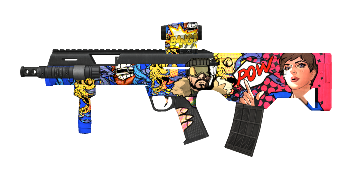MSBS Comic is a bold and colorful weapon featuring vibrant Pop Art comic designs. With iconic PB characters printed right on the gun, this piece brings extra flair to every battle.